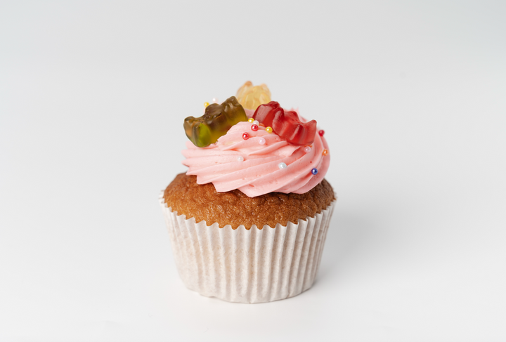 Enjoy a playful twist with our orange zest vanilla cupcake, topped with vibrant pink cream cheese frosting and a sprinkle of colourful sprinkles. The fun doesn't stop there—chewy gummy bears add a whimsical pop of sweetness to every bite, making this cupcake a joyful treat perfect for any celebration.